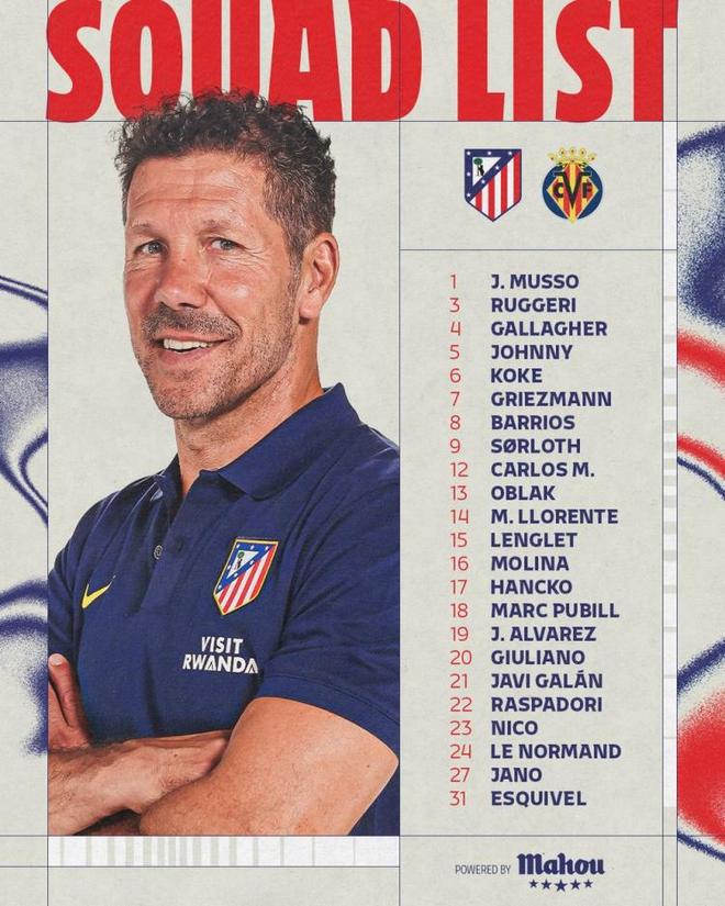 9月13日北京明天凌晨3点直播。马德里竞技队的阵容将被表达。 Atletico Madrid vs Villarreal Roster: Administrators: 1-Muso, 13-Obrac, 31-Eskiwell Defenders: 3-Rugeri, 14-Marcos Llorente, 15-Langle, 16-Molina, 17-Hanzko, 18-pubir, 21-Xavi Garland, 24-Lenerman Midfielders: 4-Galragel, 5-Cardos, 6-Cock, 8-Pablo Barrios, 27-Monserrat前锋:7-Griezmann,9-Sollot,12-Carlos Martin,19-Alvarez,20 Gigiano Simeone,22-Laspadori,23 Nicholas Gonzalez