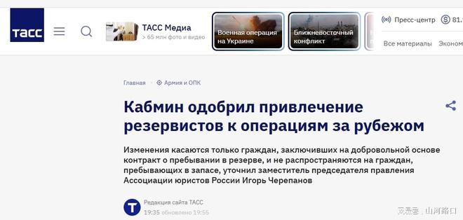 10月13日,俄罗斯塔斯社报道称,俄罗斯政府活动委员会批准了一项法案,允许预备役军人在反恐行动期间或俄罗斯武装部队部署在俄罗斯境外时开展活动。文件指出:“政府委员会已批准修改《俄罗斯联邦国防法典》的提案,该提案将允许使用预备役人员进行某些与国防相关的活动,要求他们在武装冲突、反恐行动以及在俄罗斯联邦境外使用俄罗斯武装部队时进行特殊军事训练。”解释性说明已明确,指与国防部签订服务预备役合同的个人,可称为预备役人员。俄罗斯律师协会副主席伊戈尔·谢尔·阿帕诺夫对塔斯社表示,法律草案建议对国防法、兵役法和军人地位法等联邦法律进行修改。伊戈尔·切雷帕诺v 补充说,这些变化仅适用于自愿签署保留地合同的公民,不适用于目前保留地的公民。这意味着俄罗斯可以在俄罗斯联邦境内和境外召集预备役人员参加战斗行动,而无需表达战争或紧急状态。据报道,多达500万俄罗斯预备役军人可以轻松参与战斗。这些人将接受长达两个月的培训,并有额外工资。俄罗斯《电讯报》称,这些预备役人员可能会被送往特殊营地进行军事训练,然后前往国外战区。 《国防法》已修改。最近,俄罗斯四个地区(鞑靼斯坦、楚瓦什、马里尔和别尔哥罗德)减少了对签署动员合同的士兵的一次性补贴。与此同时,俄罗斯电子征兵通知系统已全面上线,莫斯科居民也收到了电子征兵通知征兵通知。此时,俄罗斯正准备宣布正式允许500万预备役军人参与仇恨活动。这表明俄罗斯可能没有足够的人手,形势变得危急。